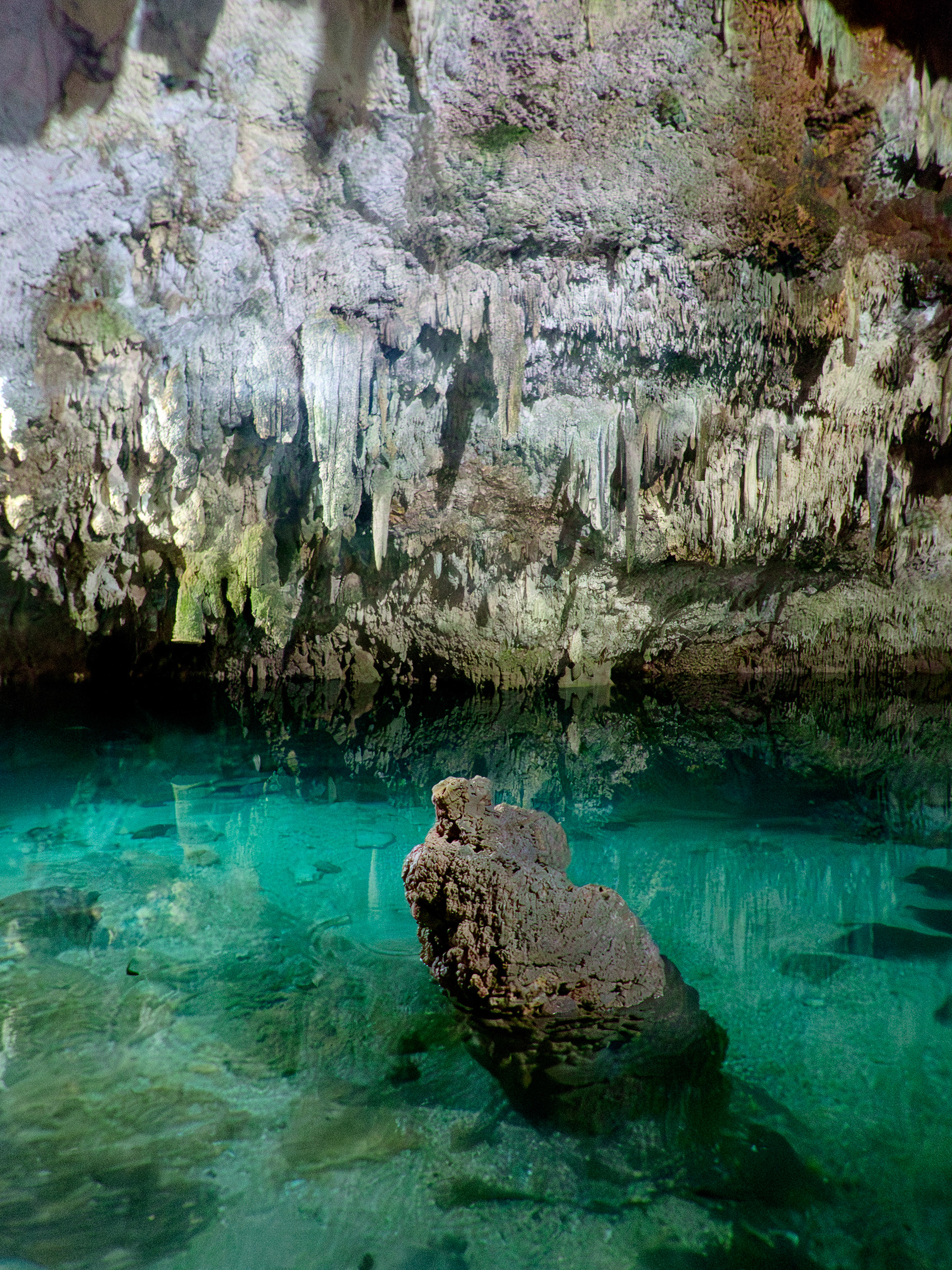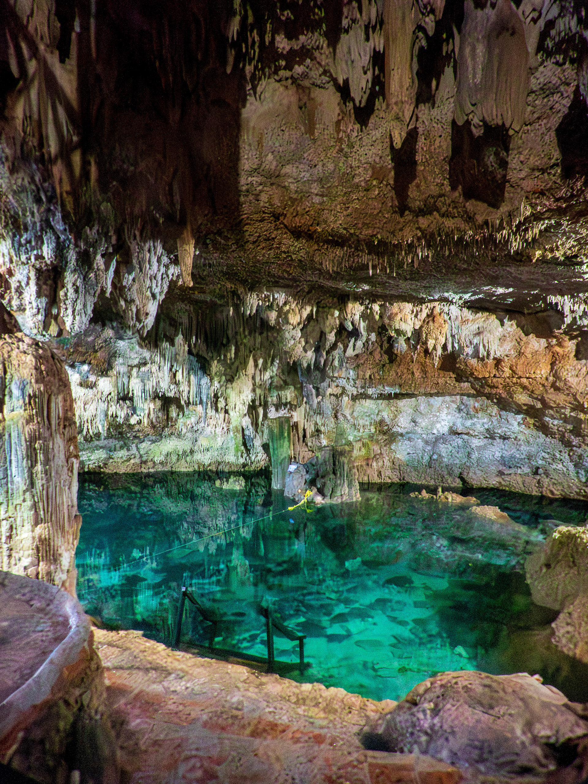 Aux alentours du site archéologique de Coba, on trouve au moins trois cénotes. Nous avons choisi ce cénote souterrain, de taille modeste. Une ambiance intime en l'absence d'autres touristes, ce qui doit être rare en haute saison…