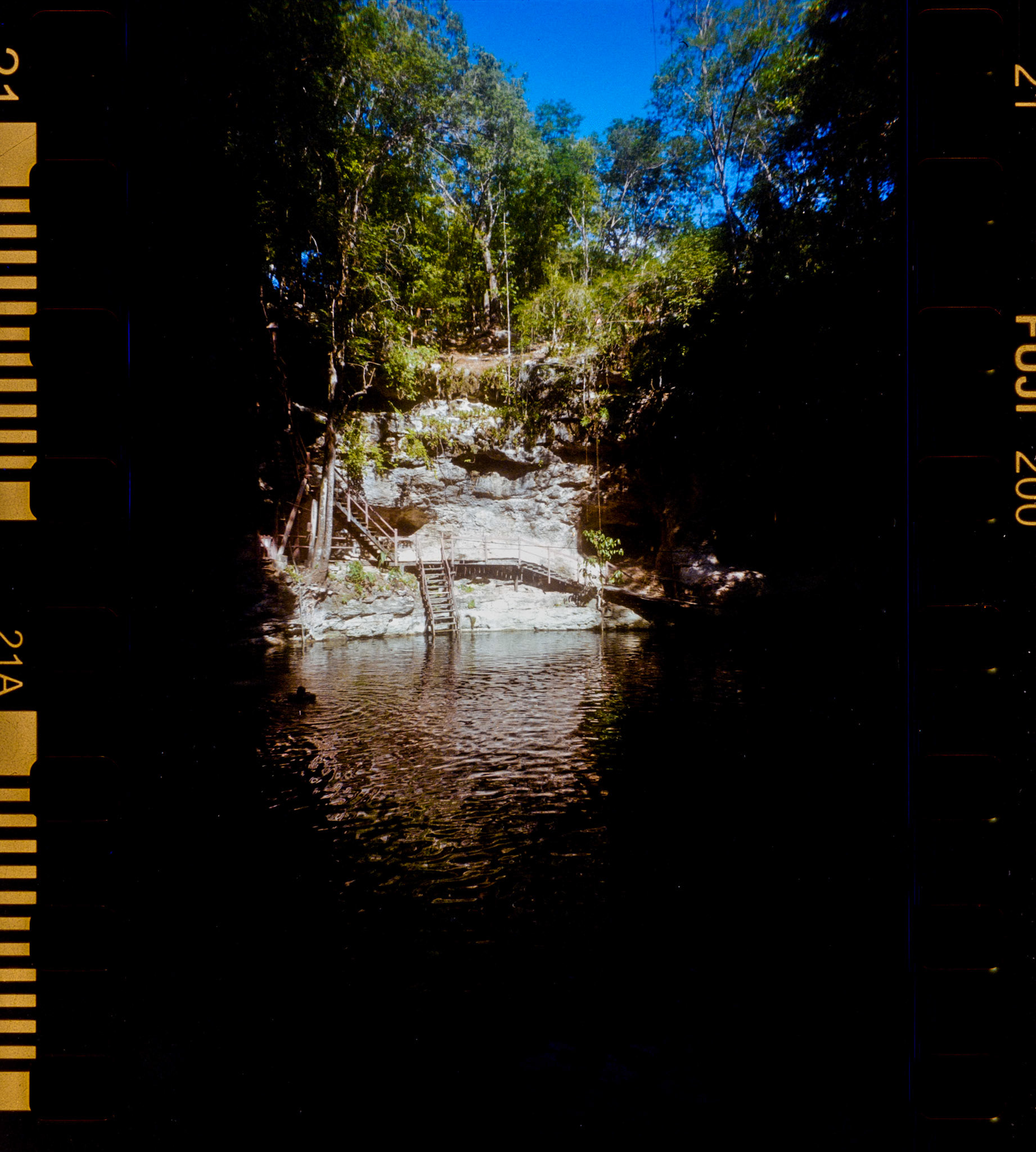 FrançaisA proximité immédiate du site archéologique de Ek Balam, le cénote X'canché offre un cadre agréable fréquenté par de nombreux oiseaux. Préparez vous à descendre 15 mètres sur un escalier particulièrement raide et étroit, mais la magie du lieu mérite cet effort. Le cénote est profond et des plate forme permettent de plonger.