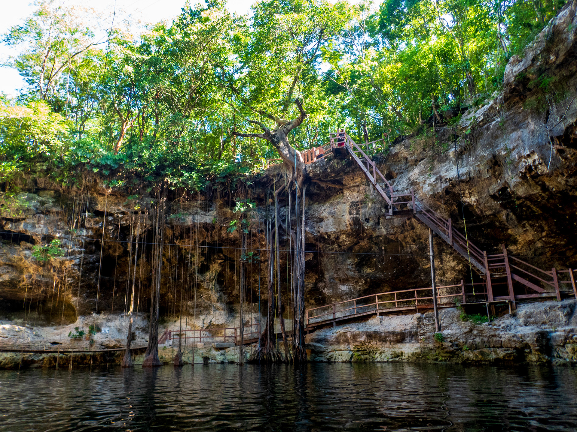 Following up on the page about the cenotes of Quintana Roo, it’s hard not to talk about those in the Yucatan region. The area around the town of Cuzama offers a wide selection, and you are welcomed in town by many guides ready to take you from one to another. For our part, it was a stopover between Merida and Chichen Itza, before another detour to Izamal. We therefore chose a complex of three cenotes for practical reasons: the Santa Barbara cenote and its 4 cenotes. Unfortunately, one was under renovation, but the variety was there, and the complex’s restaurant is highly recommendable. We were there on a Saturday, and the site was crowded; but even though the crowd isn’t to everyone’s liking, it seemed entirely local.