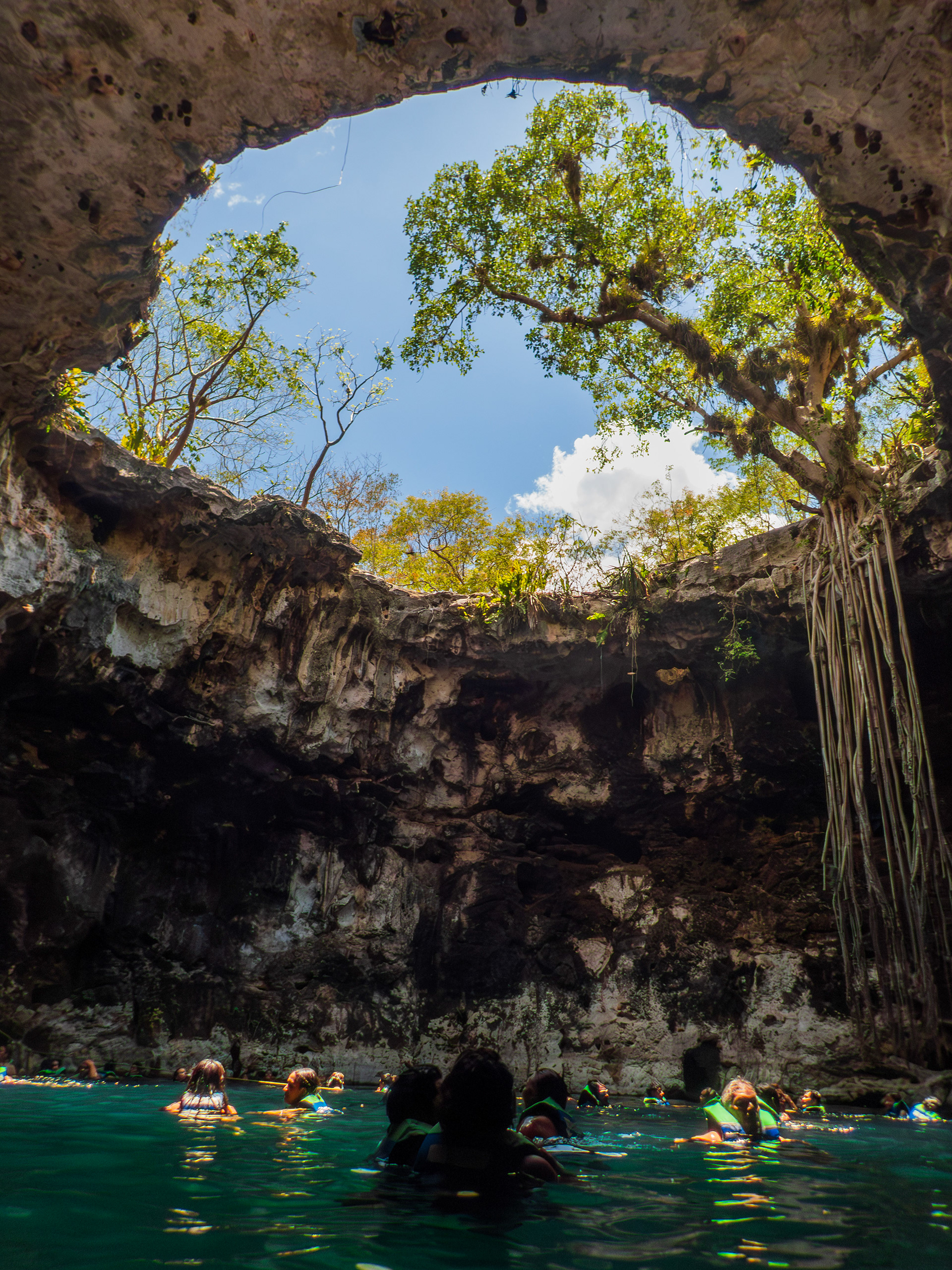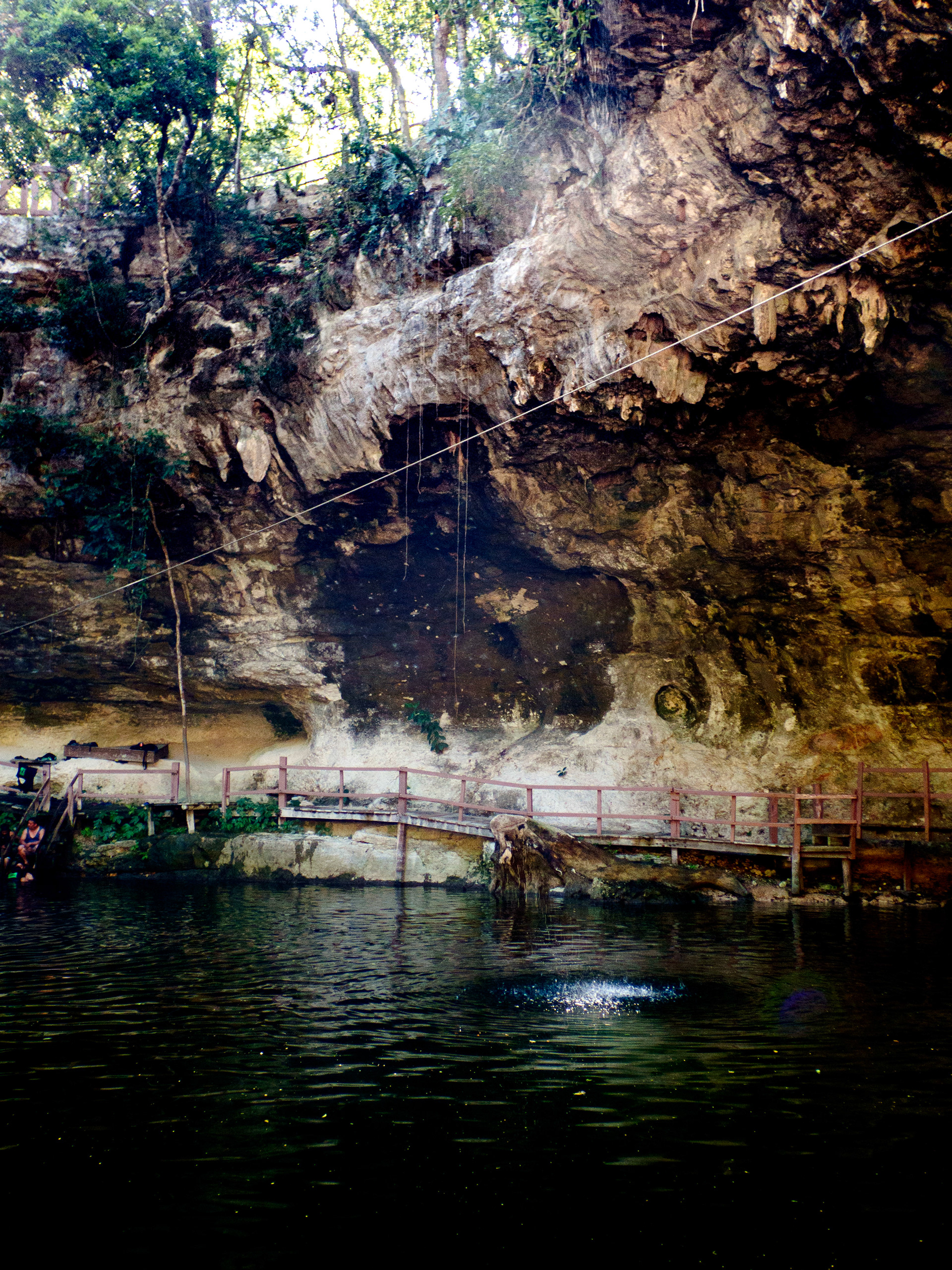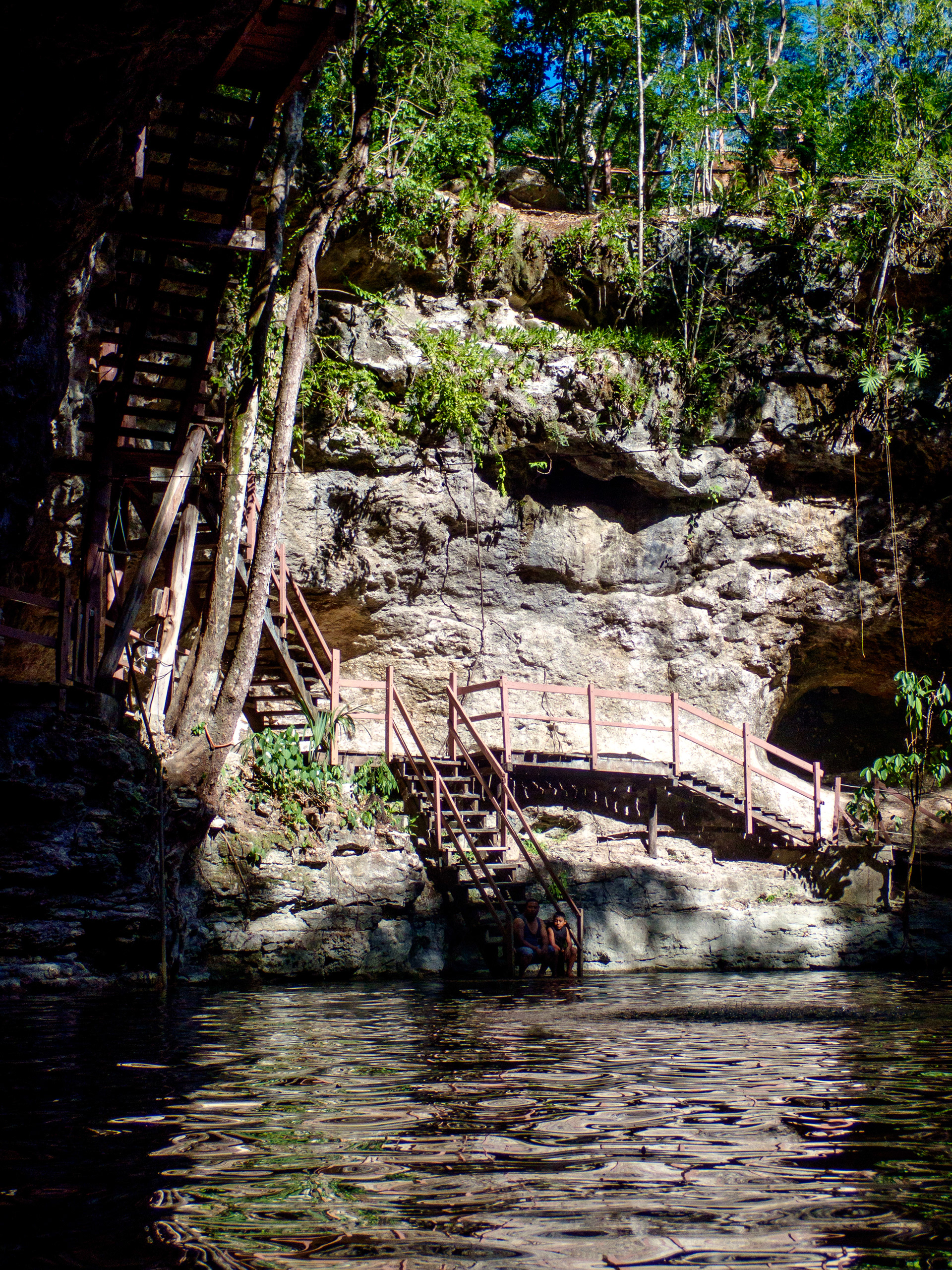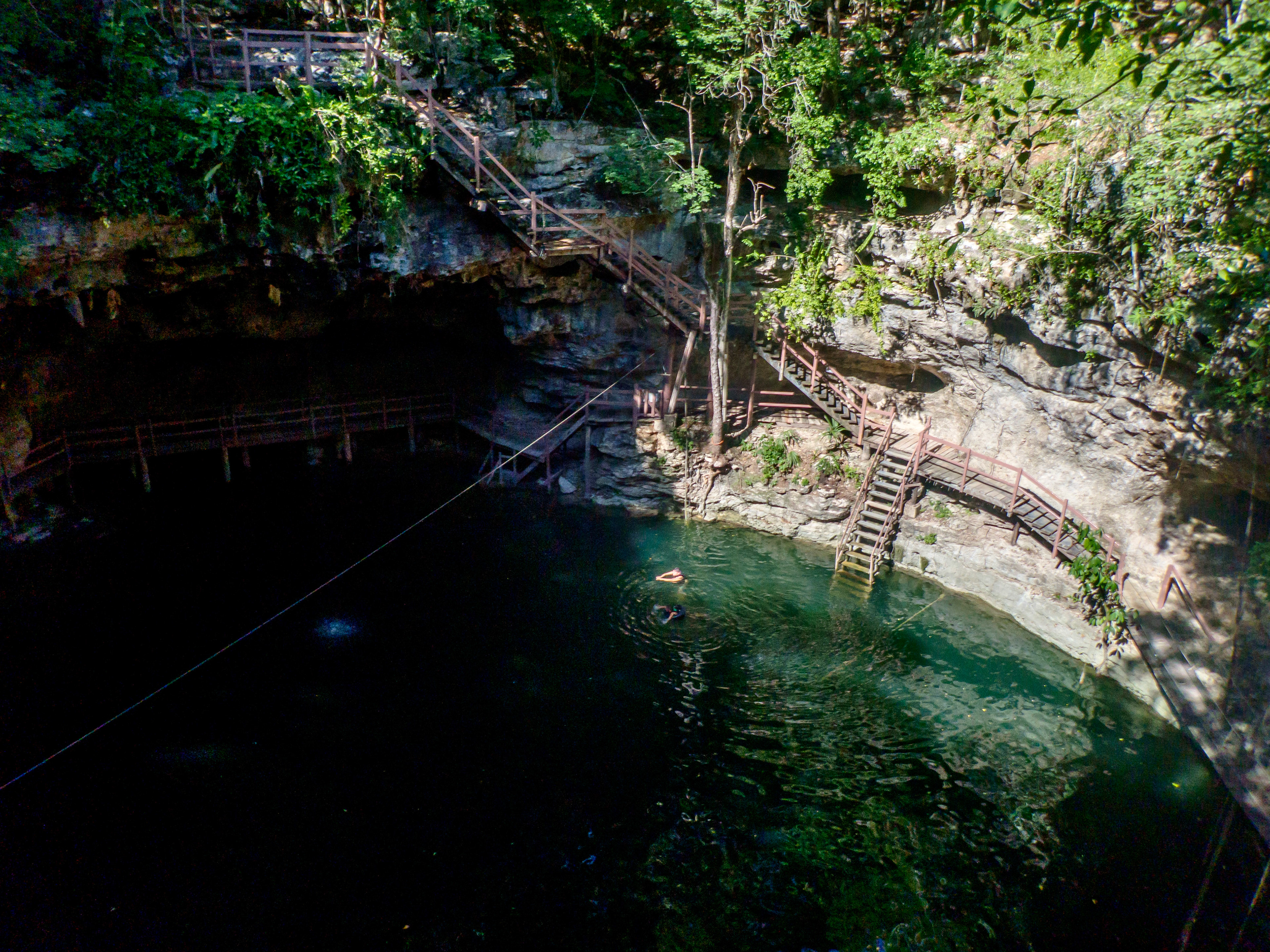 Pour faire suite à la page sur les cénotes du Quintana Roo, il est difficile de ne pas parler de ceux de la région du Yucatan. Les alentours de la ville de Cuzama proposent un vaste choix et vous êtes accueillis dans la ville par nombre de guides prêt à vous transporter de l'un à l'autre. De notre côté, il s'agissait d'une étape entre Merida et Chichen Itza, avant un autre détour pour Izamal. Nous avons donc opté pour un complexe de trois cénotes pour des raisons pratiques : le cénote Santa Barbara et ses 4 cénotes. L'un était malheureusement en travaux mais la variété était là, et le restaurant du complexe est franchement recommandable. Nous étions un samedi, le site était rempli; mais quand bien même la foule ne plaît pas à tout le monde, celle ci semblait complètement locale.